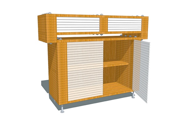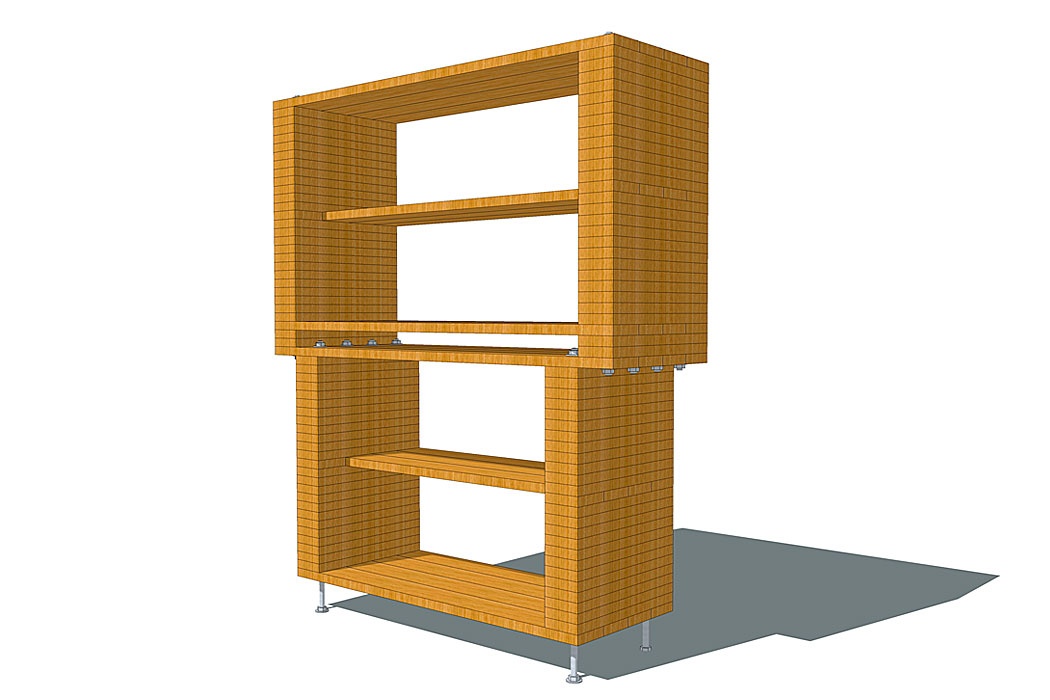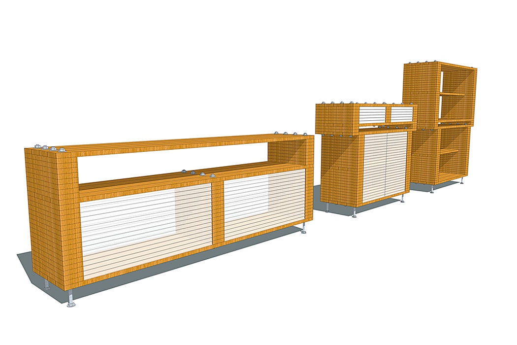 Sestava nábytku prkenný je koncipován jako systém, který je tvořen dubovými prkny o průřezu 100×25 mm, jen v různých délkách. Prkna jsou k sobě stažena pomocí nerezových závitových tyčí, matek a podložek, kdy tyto tyče tvoří zároveň nohy jednotlivých kusů nábytku. Takto sešroubované a stažené bloky dřeva jsou následně přebroušeny a celý povrch je ošetřen olejem. Doplňkovým materiálem je translucentní bílý frézovaný plast, který tvoří dvířka skříněk, čela zásuvek apod.
